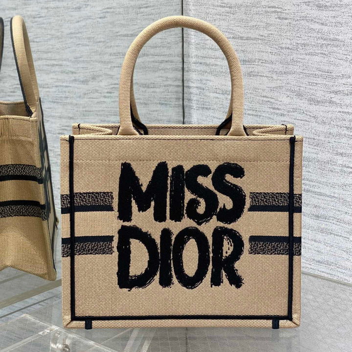 BOOK TOTE 26 BEIGE AND BLACK MISS GRAFFITI EMBROIDERY