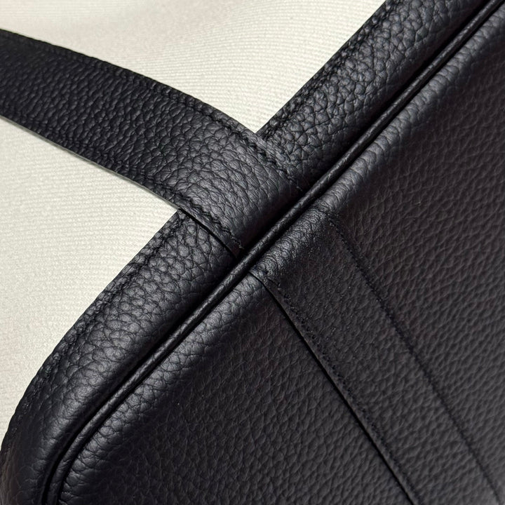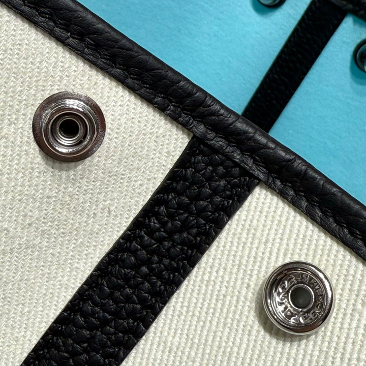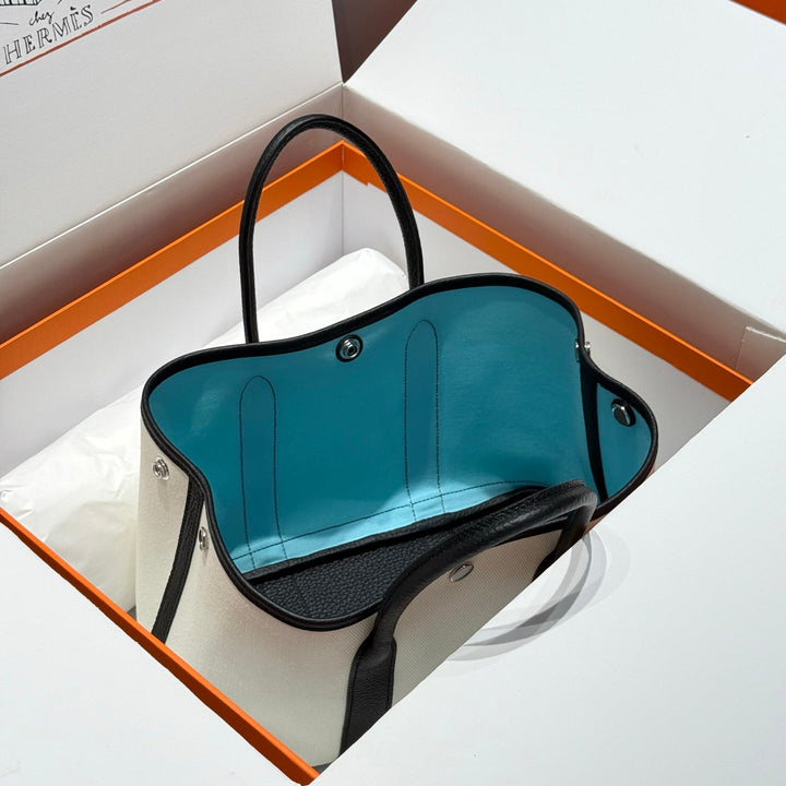 GARDEN PARTY 30CM IN WHITE TOILETS COTTON CANVAS AND BLACK CALFSKIN SKY BLUE CANVAS ON SIDE OTHER