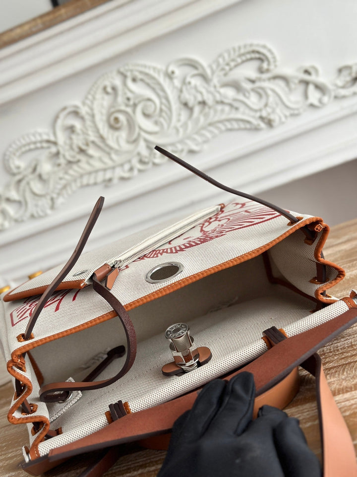 HERBAG ZIP 31 RETOURNE PEGASE POP BAG IN OFF-WHITE MIX RED CANVAS AND HUNTER COWHIDE