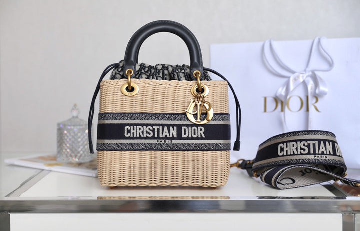 LADY 24 BASKET BAG IN BLACK OBLIQUE JACQUARD MIX BEIGE WICKER
