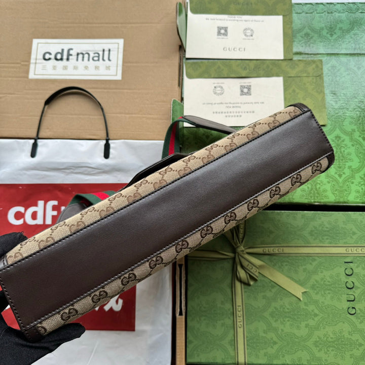 LUCE MEDIUM SHOULDER BAG 36 IN BEIGE CANVAS AND DARK BROWN CALFSKIN TRIM GOLD HARDWARE