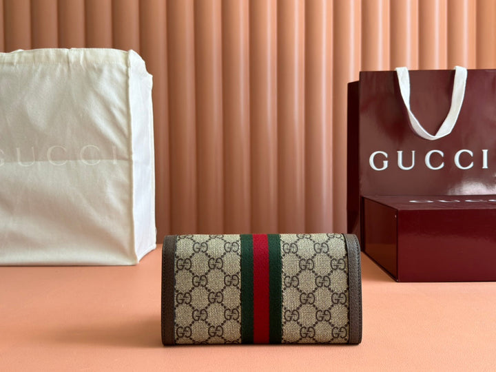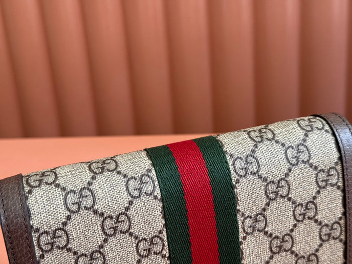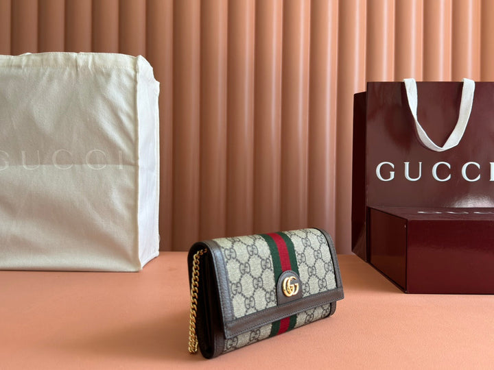 OPHIDIA WALLET ON GOLD CHAIN 19 IN BEIGE AND DARK BROWN CANVAS AND BROWN CALFSKIN