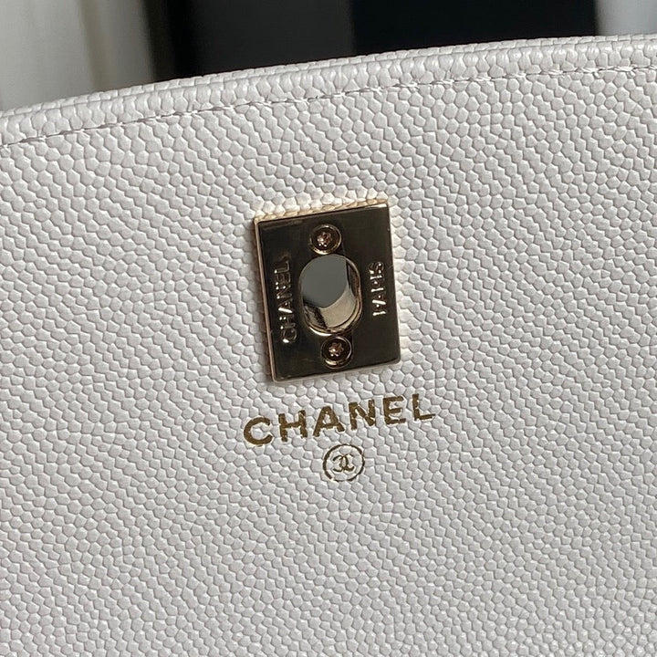 25C FLAP BAG 18 IN WHITE SHINY GRAINED CALFSKIN GOLD HARDWARE