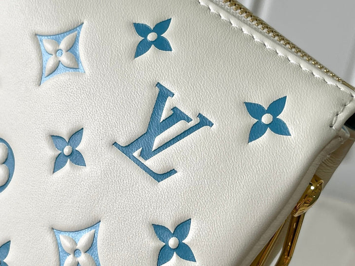 COUSSIN PM 26 IN WHITE BLUE MONOGRAM EMBOSSED LAMBSKIN GOLD HARDWARE