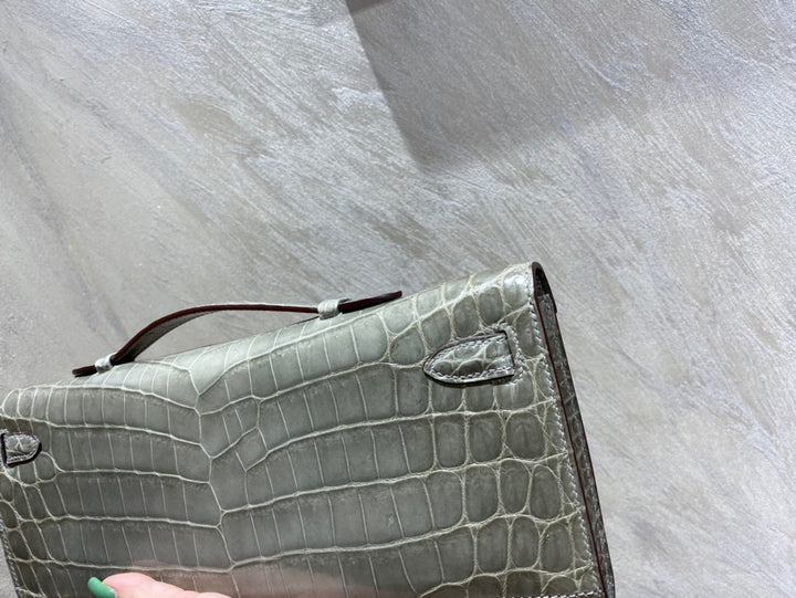 KELLY CUT 31 IN ASH GRAY SHINNY ALLIGATOR LEATHER WITH SILVER HARDWARE (MADE-TO-ODER)