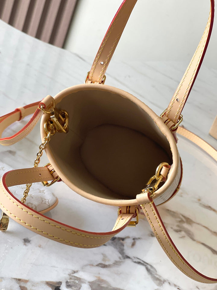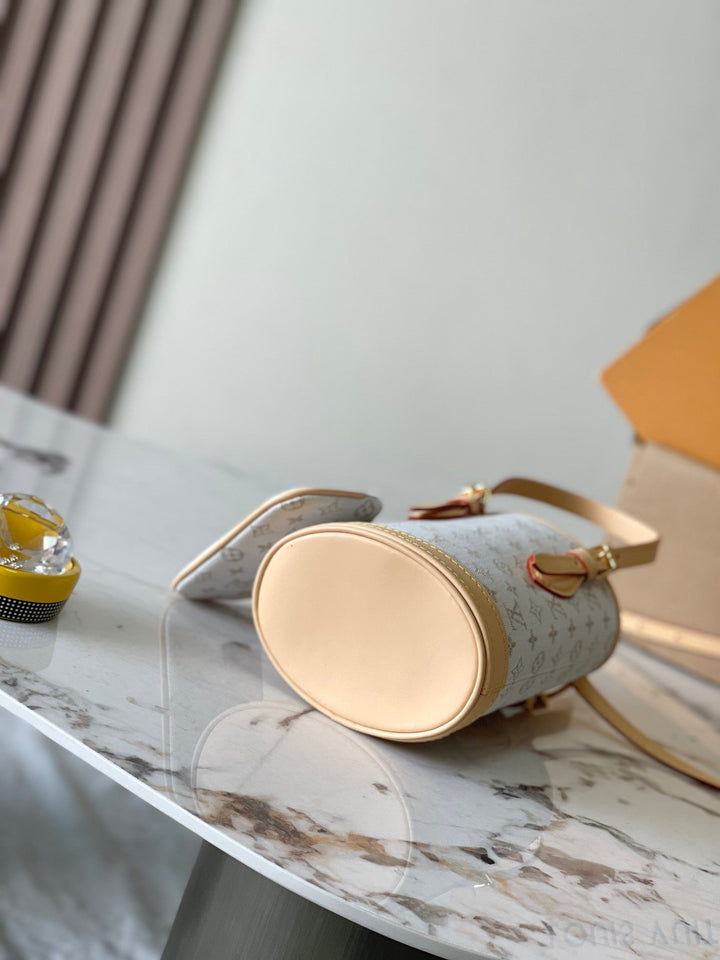 NANO BUCKET 17 IN WHITE MONOGRAM JACQUARD AND BEIGE CALFSKIN TRIM