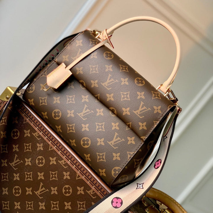 CLUNY MM HANDBAG 28 IN BROWN MONOGRAM CALFSKIN BEIGE BLACK EMBROIDERED LOGO CANVAS
