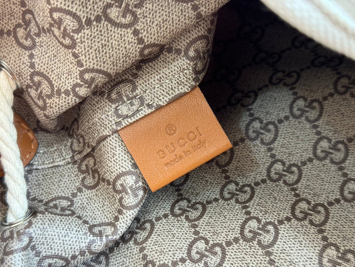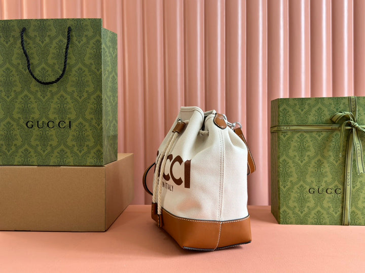 DRAWSTRING SHOULDER BAG LOGO PRINT 31 IN WHITE CANVAS BROWN CALFSKIN