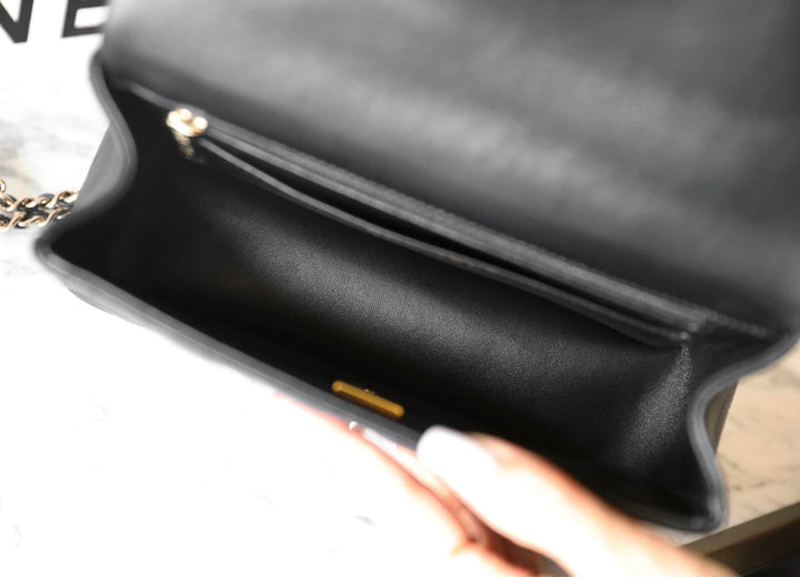 FLAP BAG 23 BLACK LAMBSKIN GOLD HARDWARE TOPHAND