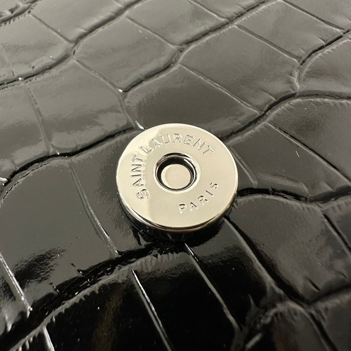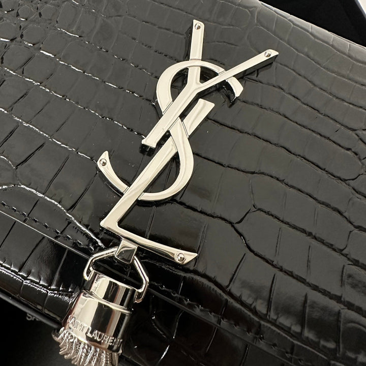 KATE TASSEL 20 BLACK CROCODILE PATTERN CALFSKIN WITH SILVER LOGO
