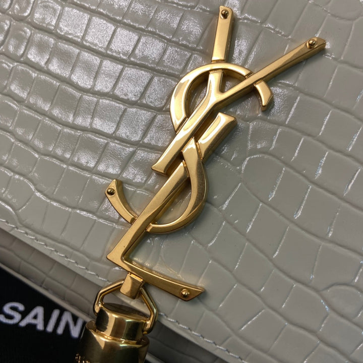 KATE TASSEL 24 CROCODILE PATTERN CALFSKIN WHITE WITH GOLD LOGO