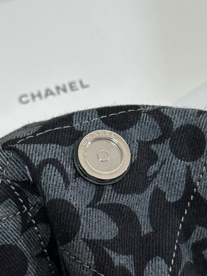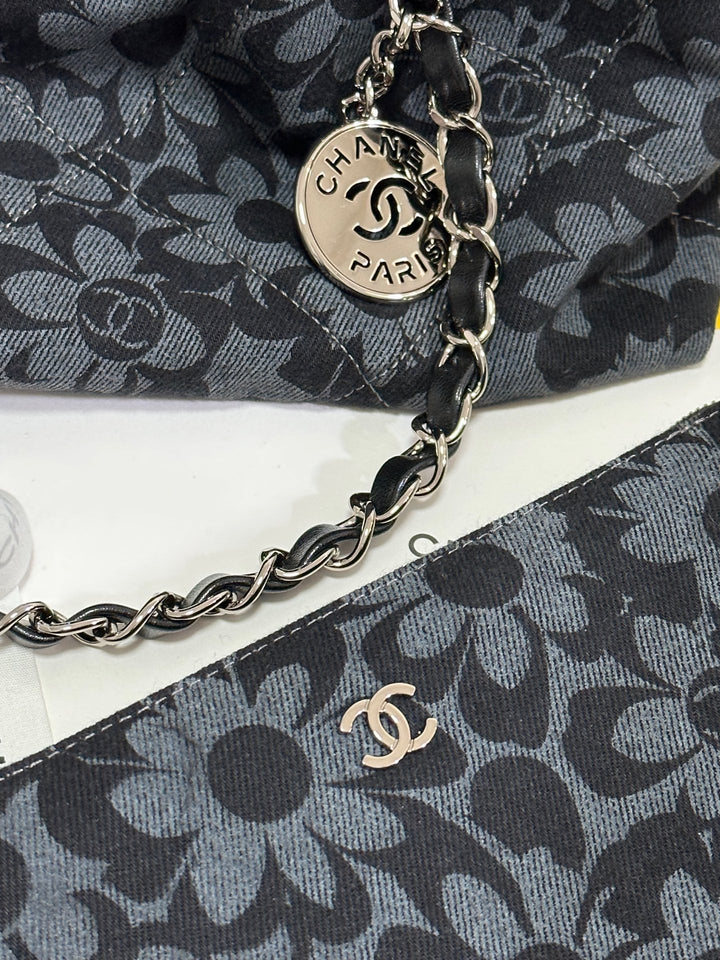 LARGE DRAWSTRING FLORAL PRINT SHOULDER BAG 39 IN BLACK MIX GREY DENIM