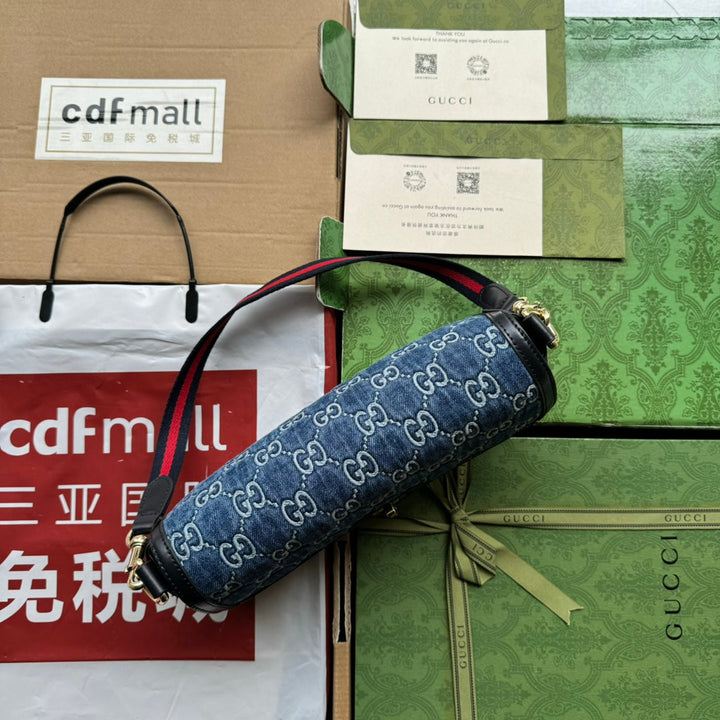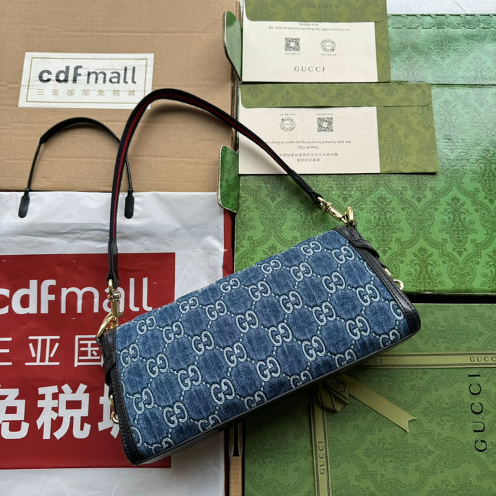 LUCE SMALL SHOULDER BAG 27 IN BLUE EMBOSSED DENIM AND BLACK CALFSKIN TRIM GOLD HARDWARE